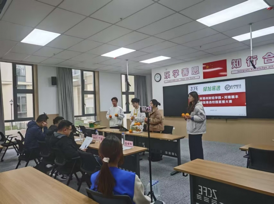 初赛现场,来自全校各院系的参赛团队各展所长。其中,有团队聚焦焦作温县本地特色农产品山药,从产地溯源、营养价值等维度进行深度讲解;有团队以“猜价格送福利”的互动游戏点燃氛围,使直播间在线人突破峰值;有的团队则是通过一些才艺和趣味性的方式来引入主题。参赛选手们凭借扎实的知识去讲解产品、灵活的控场能力和富有创意的互动设计,在直播间内营造出热烈的带货氛围,充分展现了郑财学子的青春活力与专业素养。